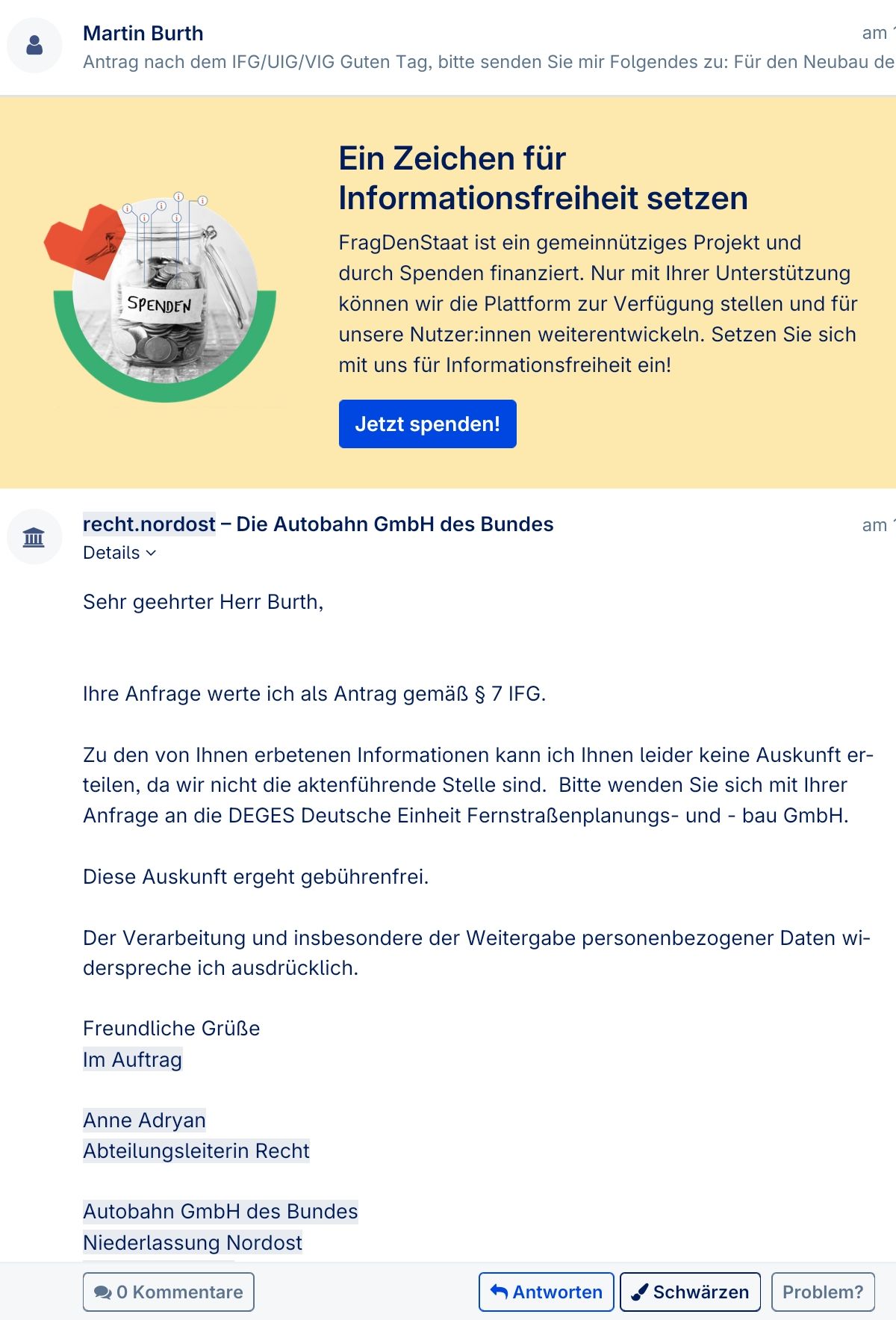 Erstmal herzlichen Dank an BARCA für die umfassende und für mich sehr hilfreichen Erläuterungen! Ich bin zwar schon seit vielen Jahren politisch zu Themen wie, Klimaschutz, Umwelt und Verkehr unterwegs, aber bezüglich IFG/UIG-Anfragen ein absoluter Neuling. Leider auch bei der Nutzung Eurer tollen Webseite und Eures fantastischen Service! Werde gleich mal eine Spende an FragDenStaat abschicken.